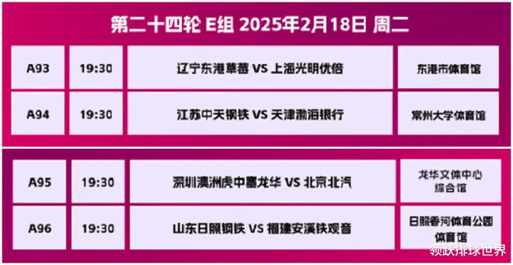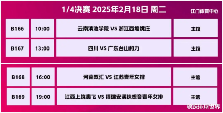 与此同期,2024-2025赛季中国女排超等联赛(B级)季后赛也进入到1/4决赛阶段,比赛工夫从2月18日-2月22日,在广东江门市江门体育中心体育馆举行,女排超等联赛B级总决赛采纳赛会制,冠亚军决赛三场两胜制,排行赛采纳单败淘汰赛制。